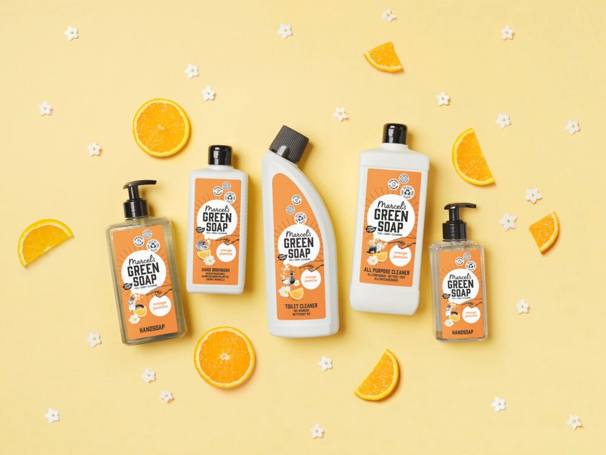 Marcel’s Green Soap afwasmiddel sinaasappel & jasmijn is gemaakt van plantaardige zepen, vegan, minstens 97% biologisch afbreekbaar en komt in een fles van 100% gerecycled plastic. Duurzaam afwasmiddel marcel’s green soap afwasmiddel is gemaakt van plantaardige zepen en dus vriendelijk voor het milieu, je huis én je lichaam. Verrijkt met essentiële olie van sinaasappel, jasmijn en zonnebloem en een heerlijk natuurlijk sinaasappel & jasmijn parfum, zodat afwassen (we durven het bijna niet te zeggen) een echte ‘geurbeleving’ wordt. En terwijl je wordt opgeslokt door die intense ervaring wordt de huid van je handen gelijk lekker verzorgd door het zachte schuim en de verrijkende ingrediënten. Het doen van de afwas was nog nooit zo ontspannen! tenzij je de vaatwasser aan het werk zet natuurlijk. Gelukkig heeft marcel ook ecologische vaatwastabletten ontwikkeld! bomvol natuurlijke ingrediënten zoals alle producten van marcel’s green soap bevat ons afwasmiddel geen kleurstoffen, parabenen, fosfaten, chloor, ammonia of zuren. Sterker nog, het afwasmiddel zit bomvol natuurlijke ingrediënten en is minstens 97% biologisch afbreekbaar. Sinaasappel & jasmijn jasmijn heeft een mysterieuze, bedwelmende toon, en schijnt ook een romantisch afrodisiacum te zijn. Als dat jouw relatie met schoonmaken niet versterkt! gelukkig voegt de sinaasappel hier de nodige nuchterheid en frisheid aan toe. We zijn hier tenslotte wel om schoon te maken…